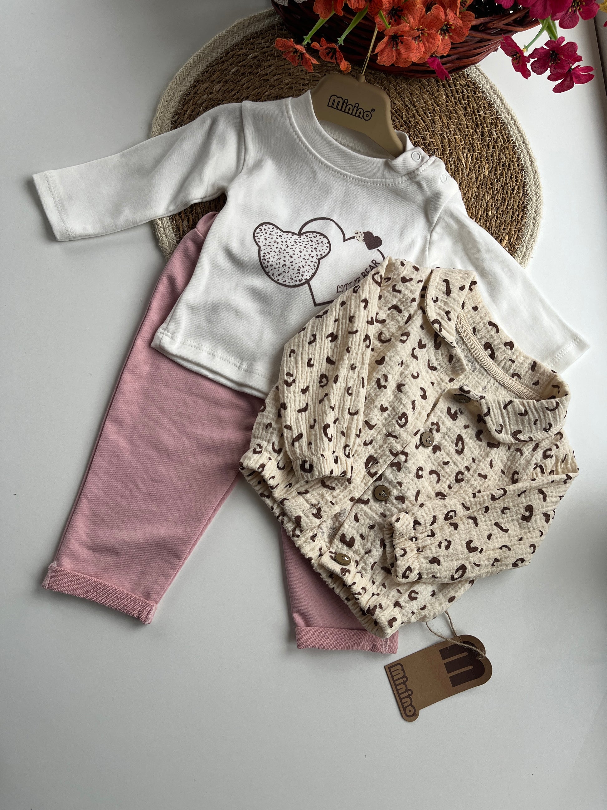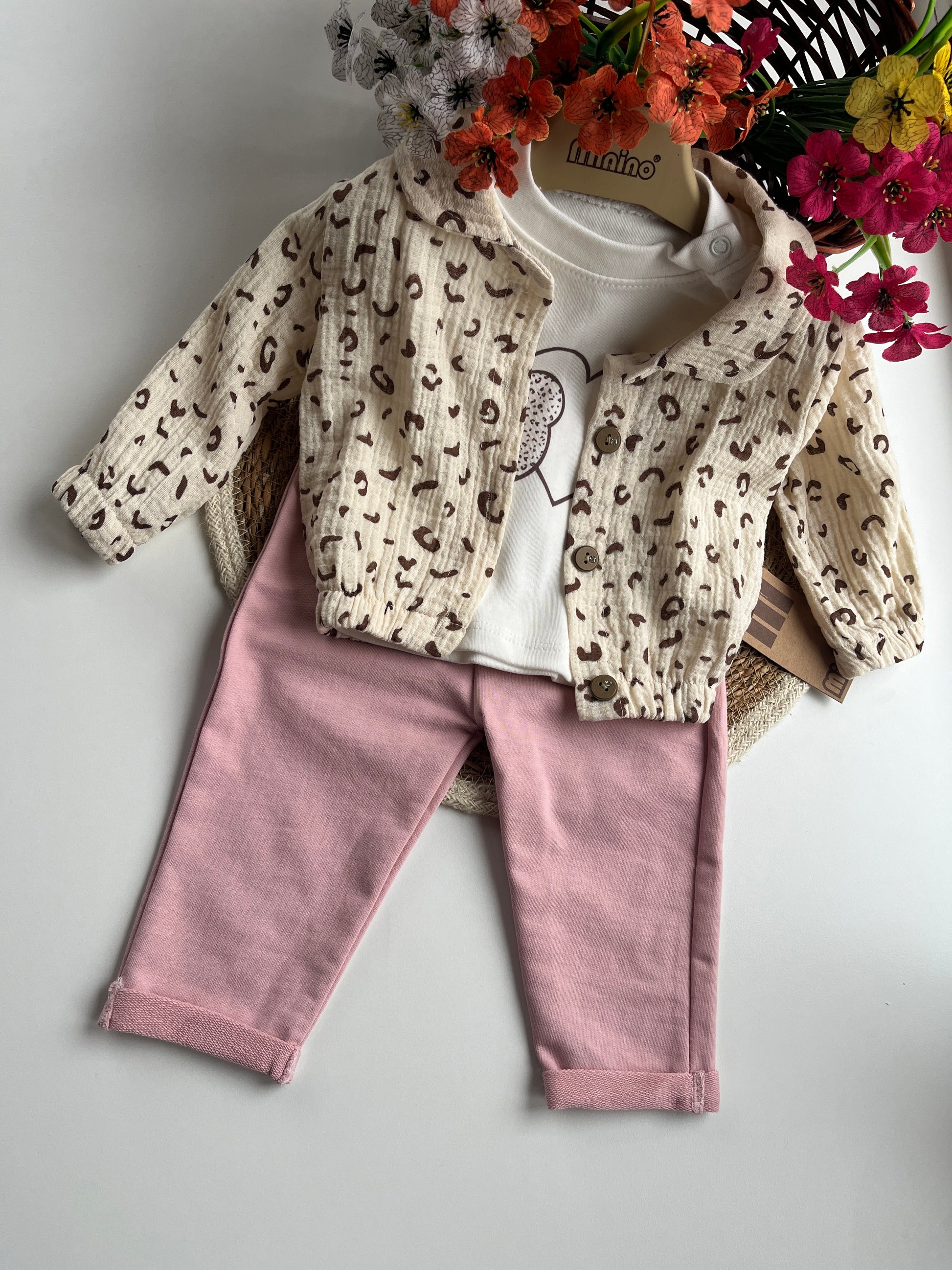 Бебешки комплект от 3 части-блузка, муселиново горнище и панталон. 100% памук.