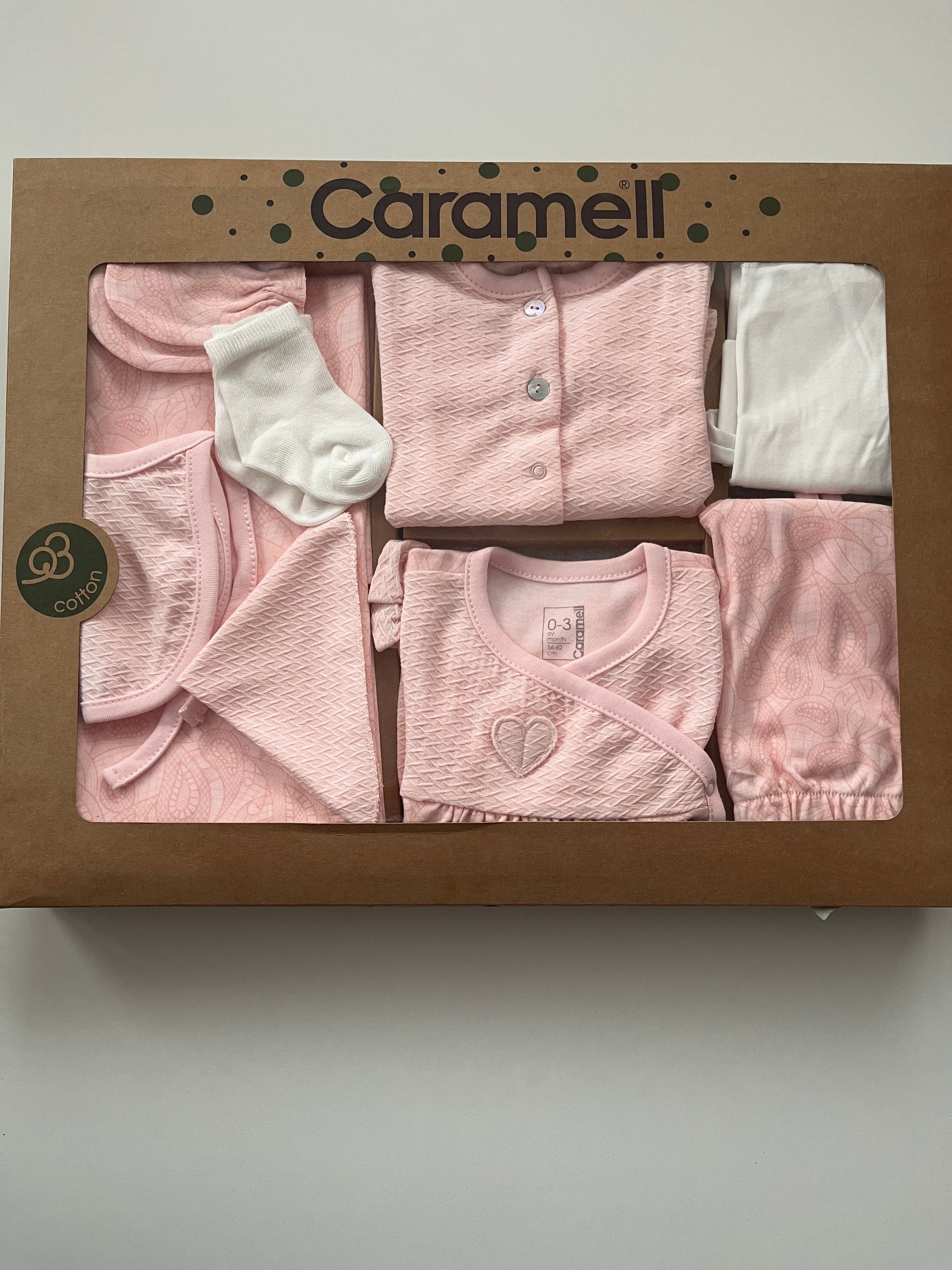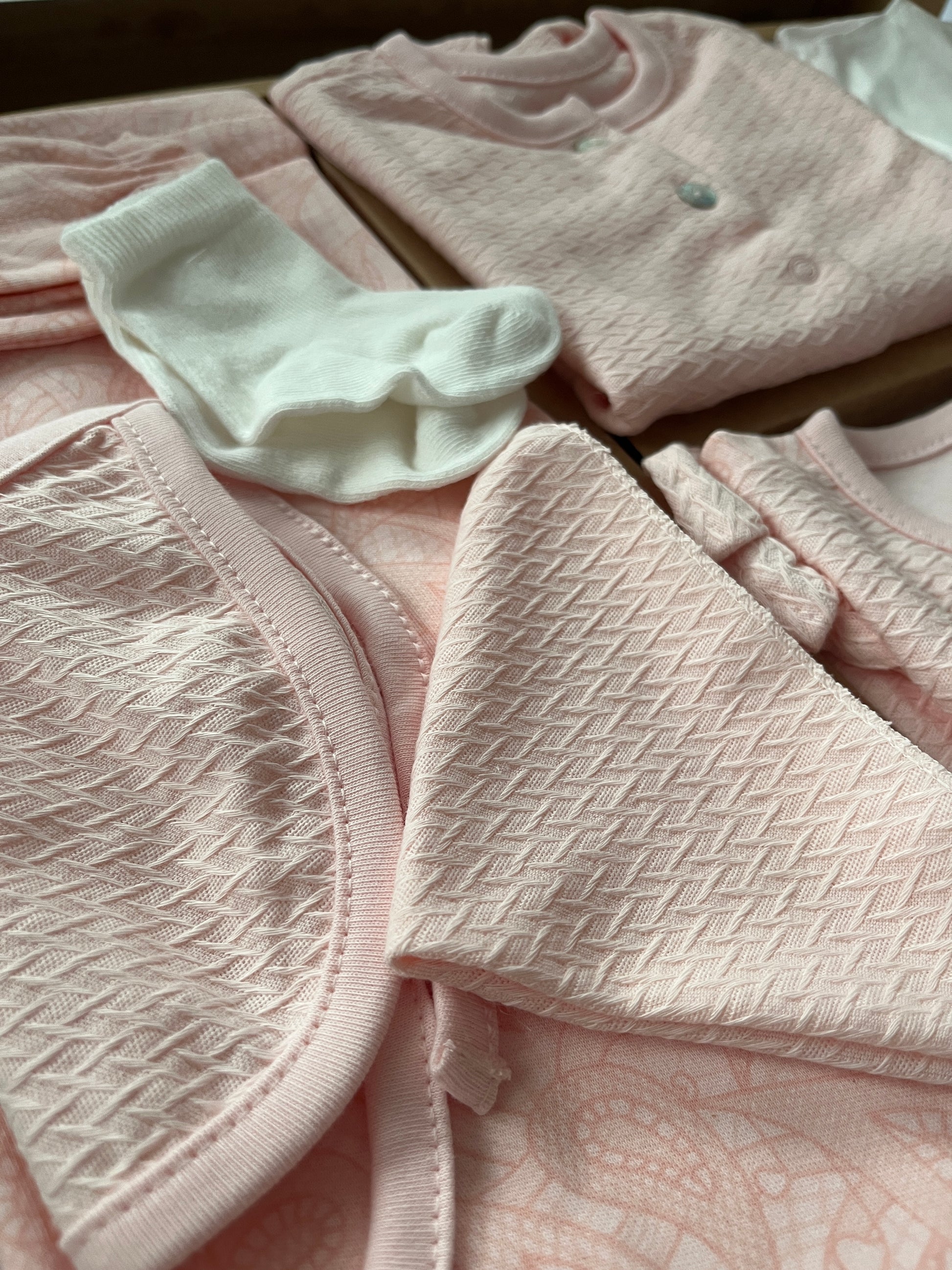 Комплект за изписване 9 части за момиче. Комплектът включва всичко необходимо-ританки, гащеризонче, блузка, камизолка, шапка, ръкавички, лигавник, одеалце, кърпичка.