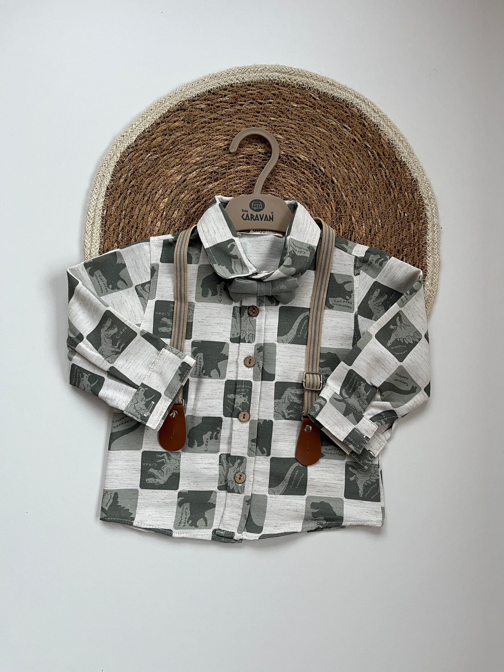 Елегантен комплект за момче. Комплектът включва-риза, панталон, тиранти и папионка. Създаден изцяло от 100% ПАМУК.