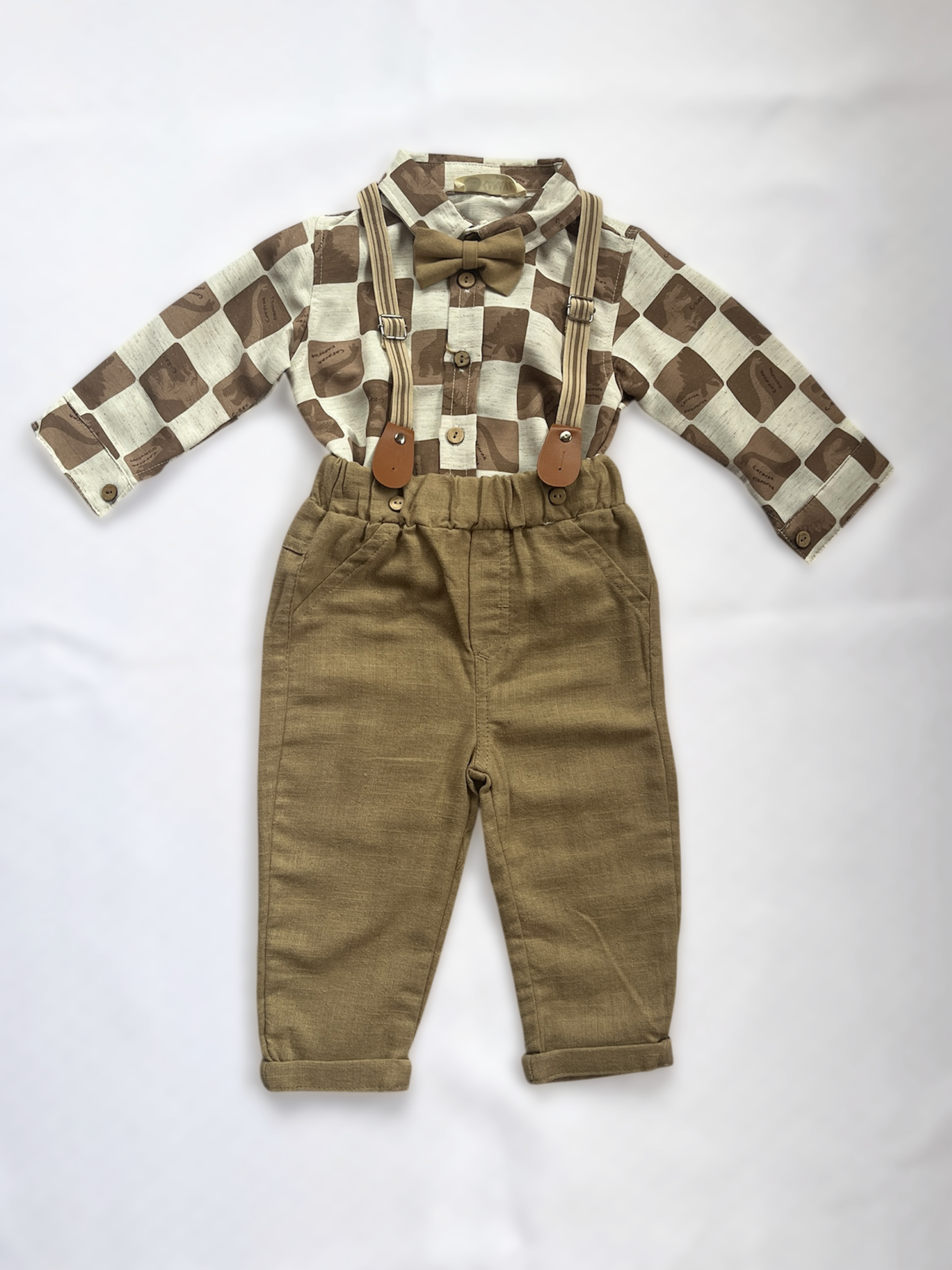 Елегантен официален комплект за момче, съчетаващ класически стил със забавни сафари елементи. Комплектът включва риза с декоративни детайли, панталон, тиранти и папионка – всичко необходимо за перфектния официален вид. Изработен от 100% памук, осигурява мекота и дишащост през целия ден, идеален за специални поводи, празници или семейни събирания.