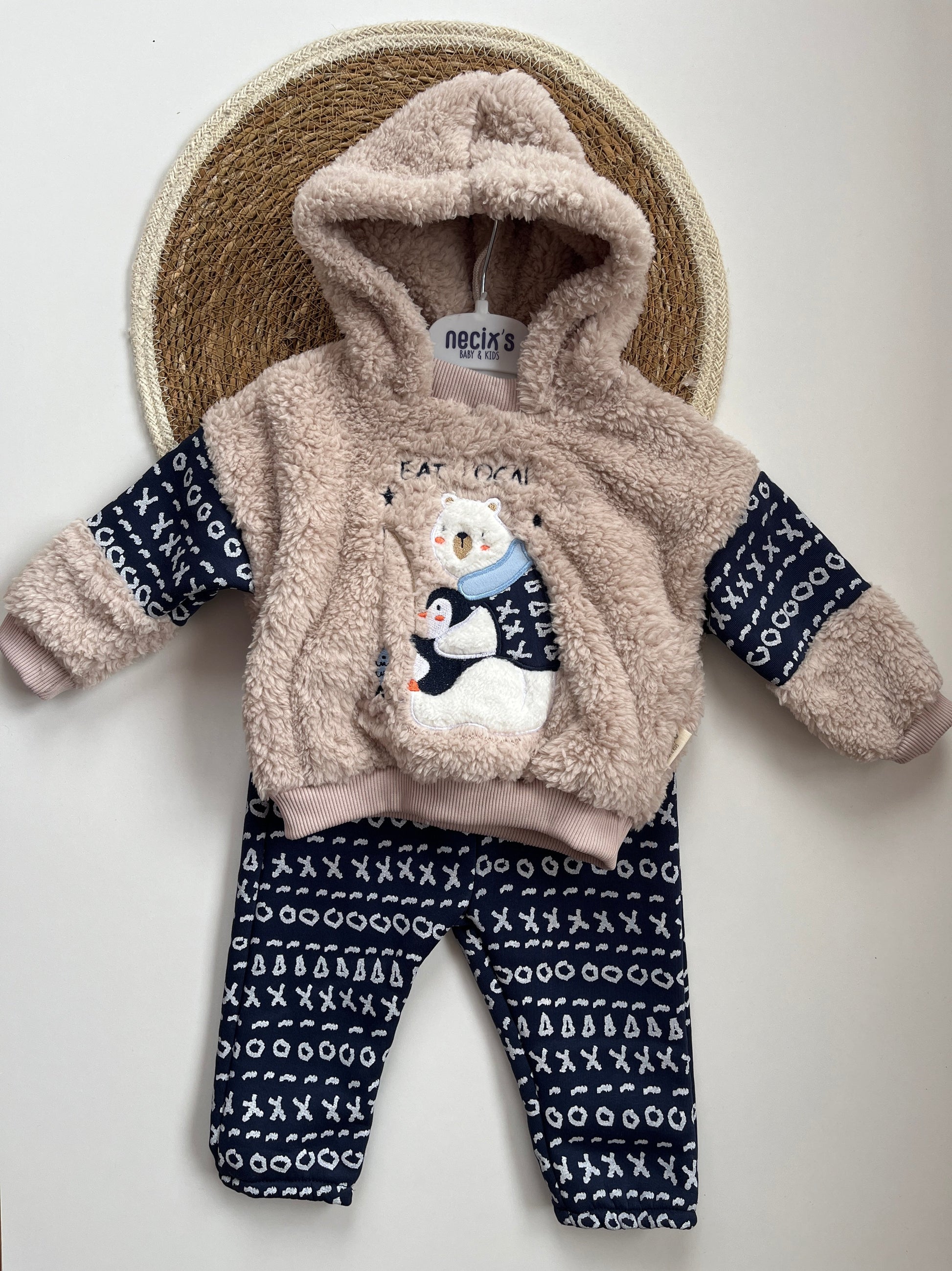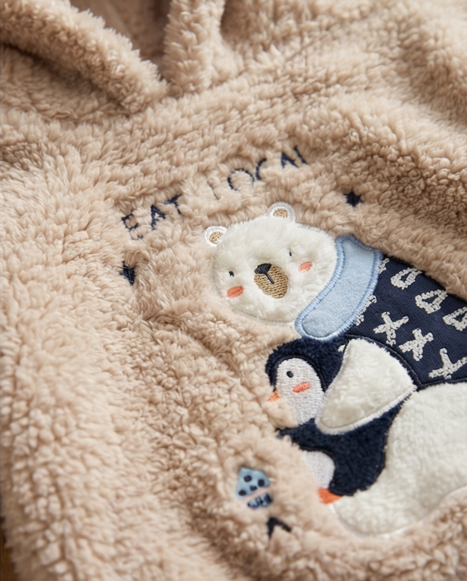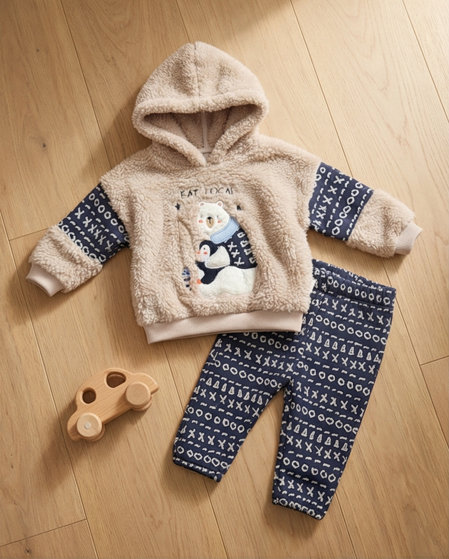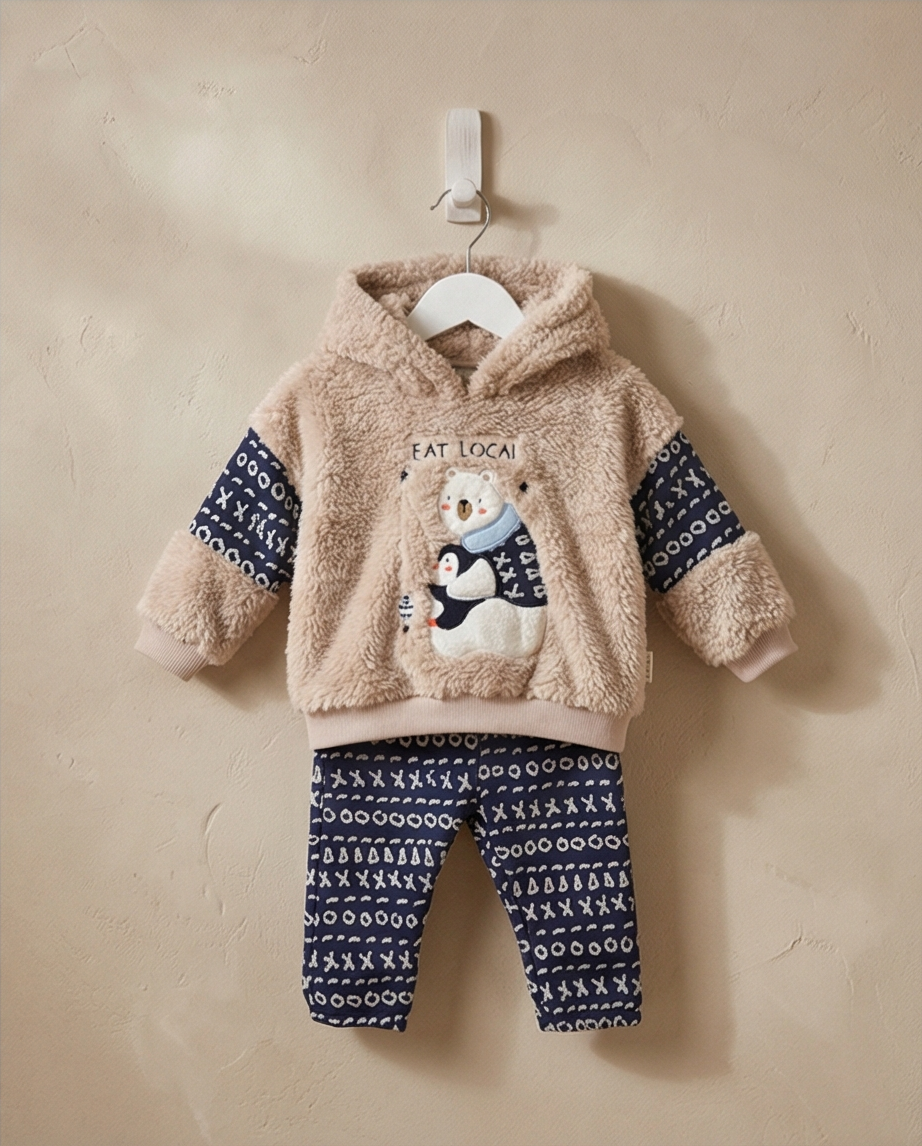 Комплектът включва плюшена блуза с качулка в светъл тон с принт на мече и тъмно син ватиран панталон с шарки. Съчетава комфортна кройка и модерна визия, подходяща както за разходки, така и за ежедневие.