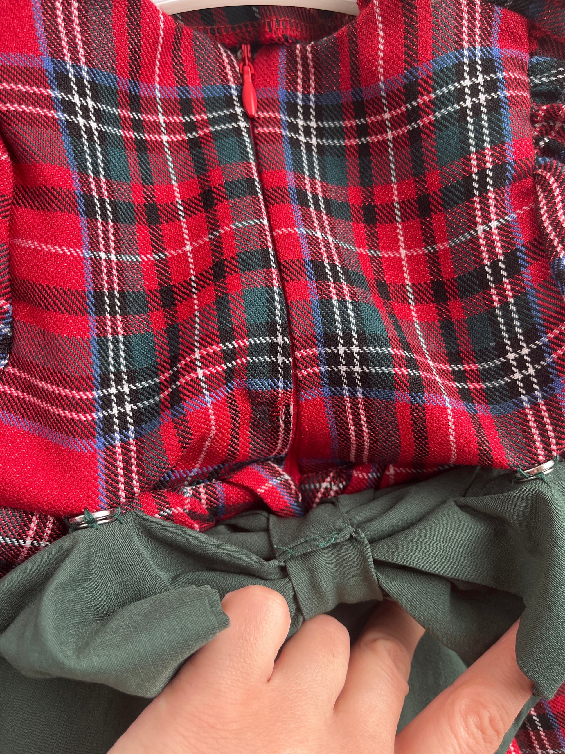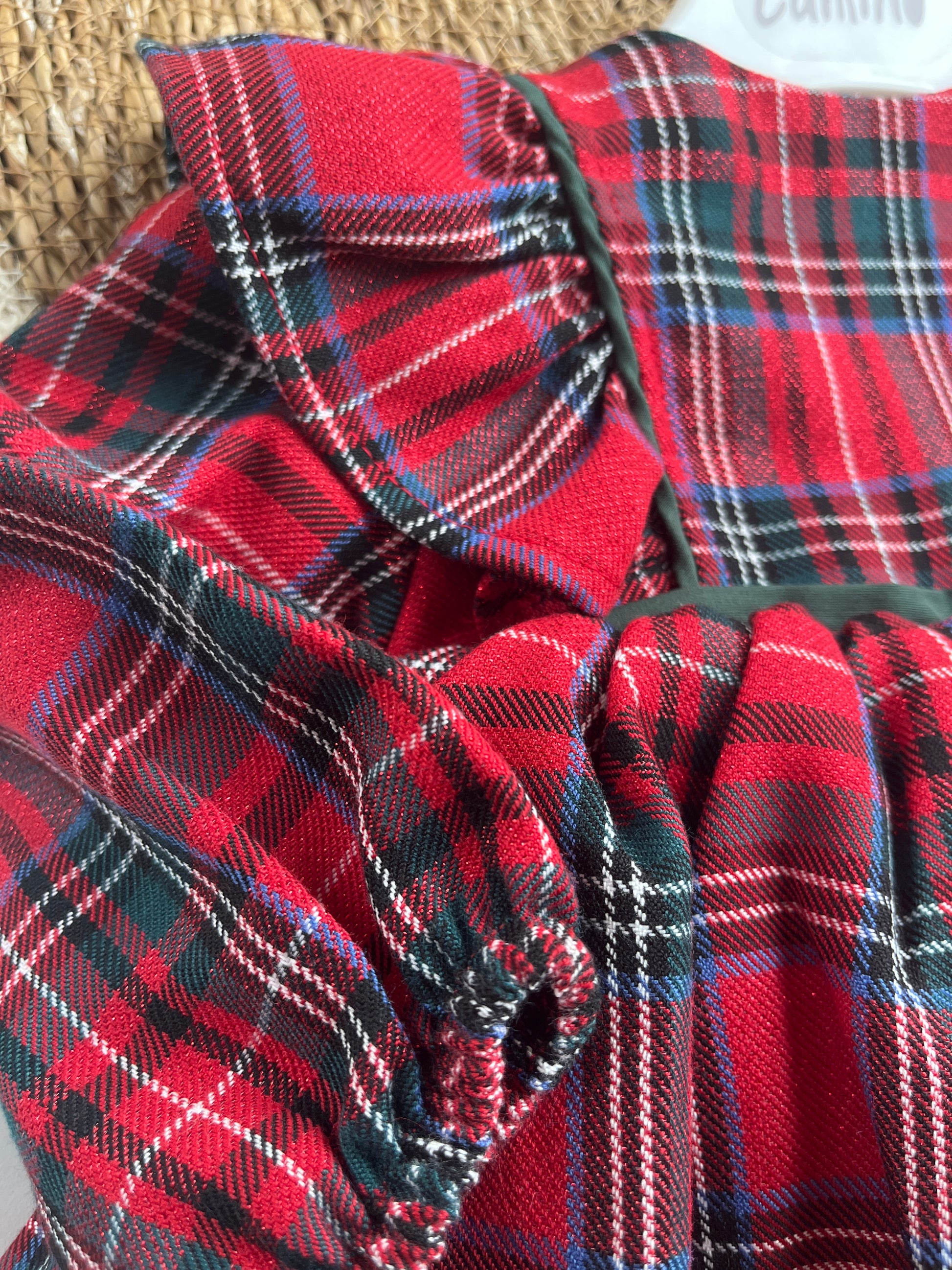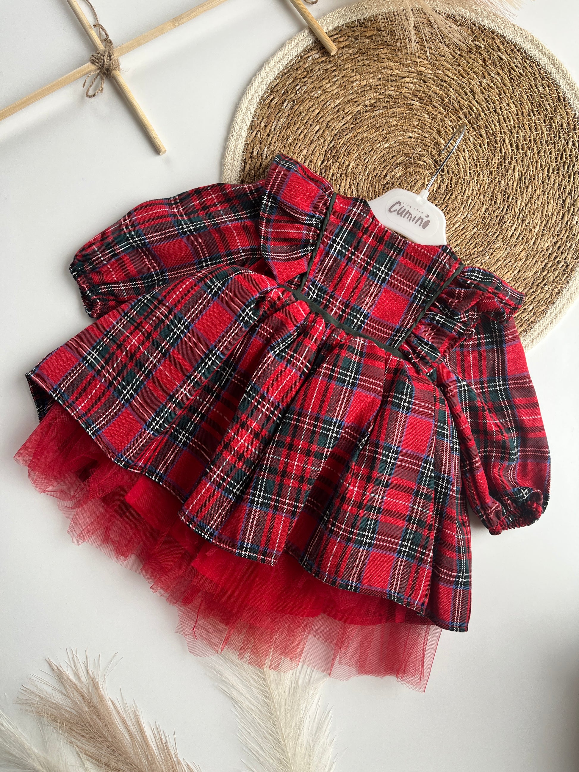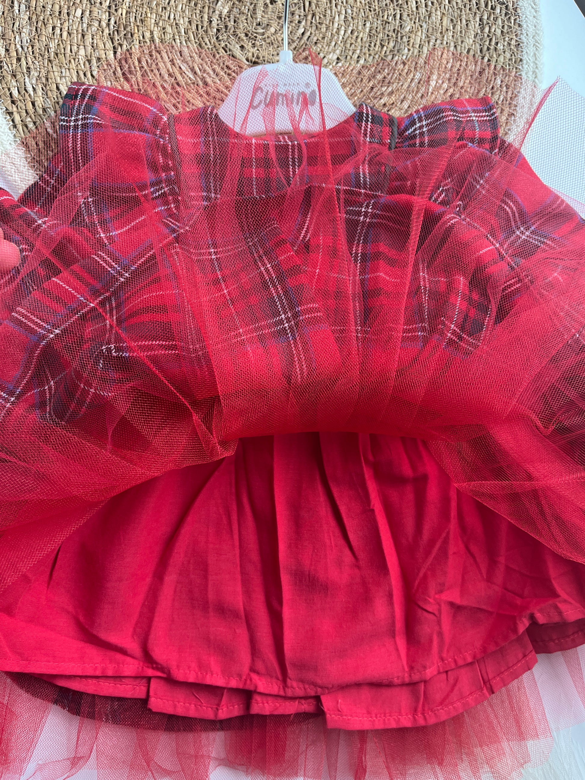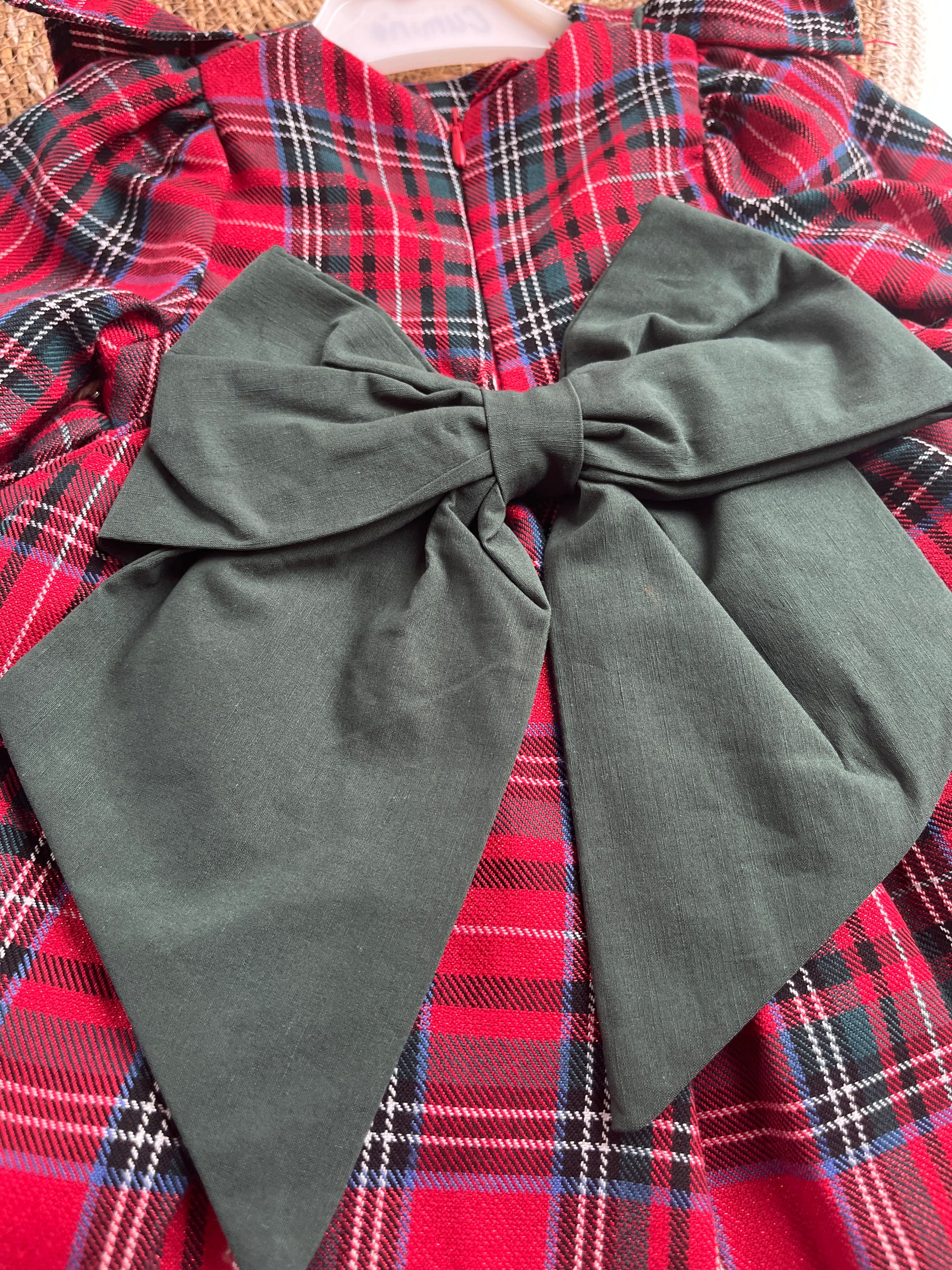Карирана червена рокля за бебе с голяма тъмно-зелена панделка на гърба, която може да се откопчава и да се свали.