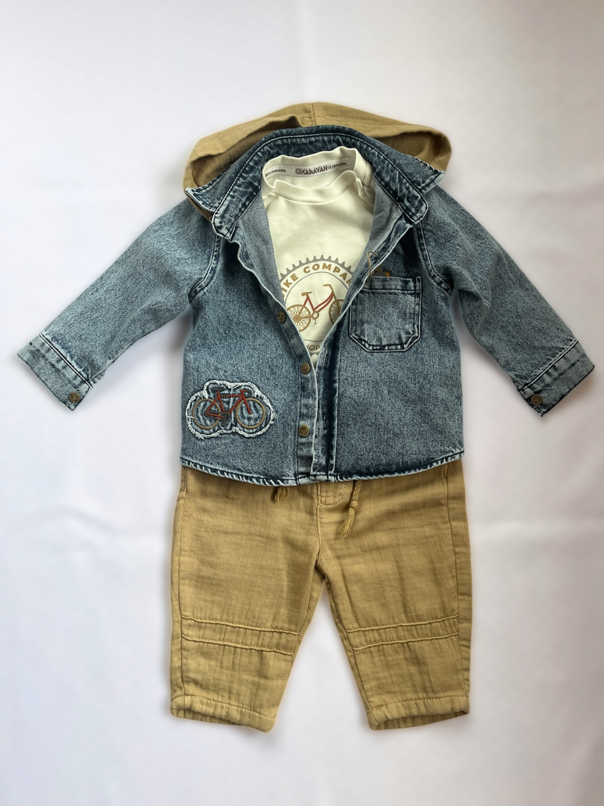 Спортно елегантен комплект, идеален за всеки повод. Комплектът включва дънково яке, удобна тениска и панталон, които се комбинират перфектно за стилен и практичен вид. Изработен от 100% чист памук, материята е мека и дишаща, осигурявайки максимален комфорт през целия ден. Перфектен избор за активни малчугани, които искат да изглеждат добре.