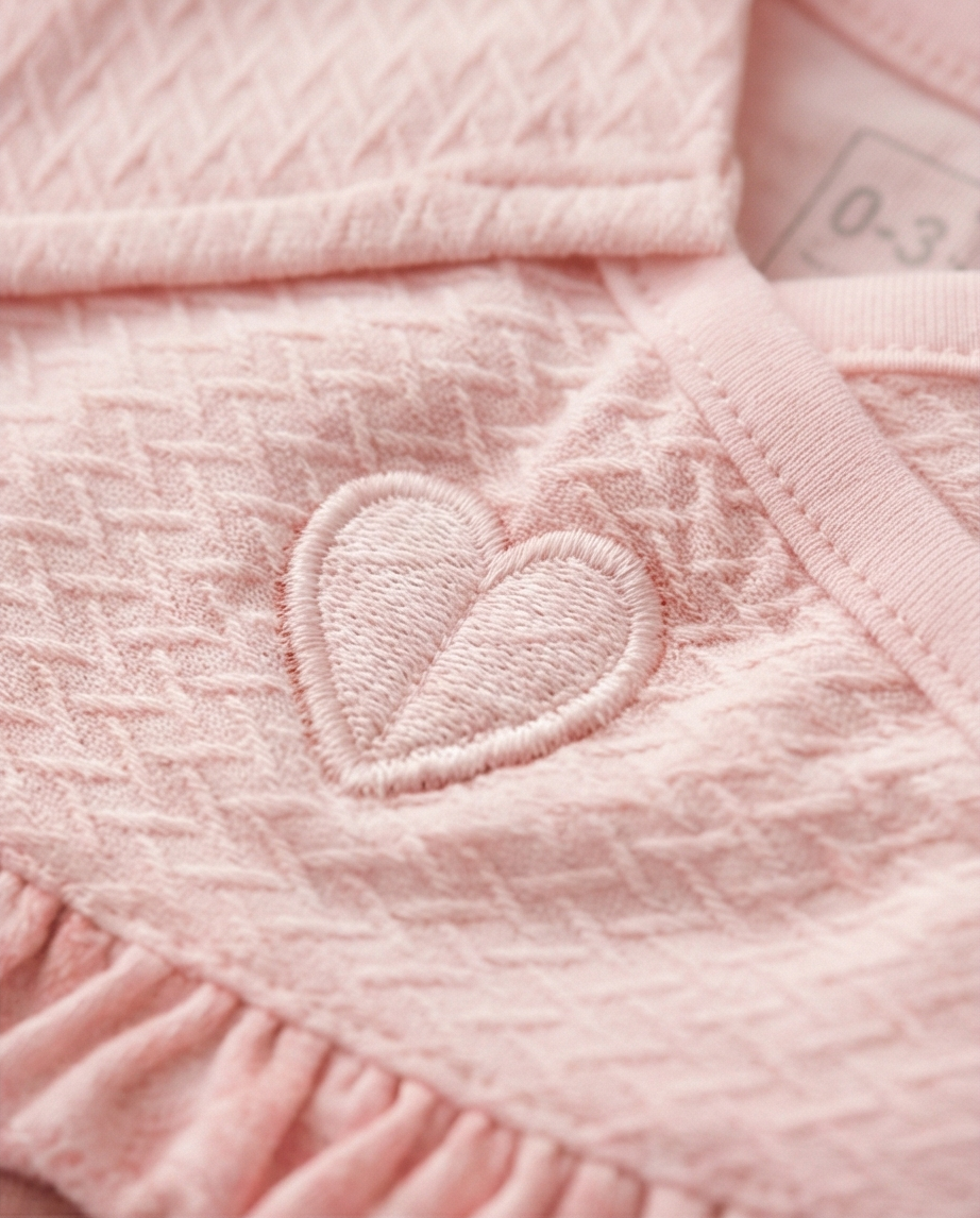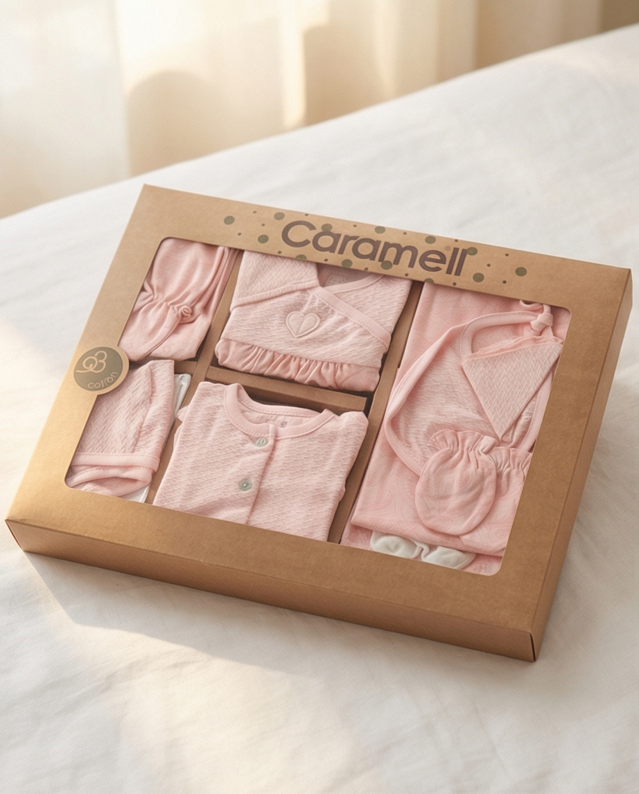 Комплектът на марката CaramellBaby е с изключително нежна и мека материя, в цвят розово, изработен от 100% памук.